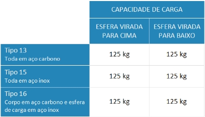 tipos 13 (toda em aço carbono), 15 (toda em aço inox) ou no tipo 16 (corpo em aço carbono e esfera de carga em