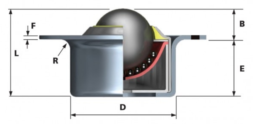 Esfera transferidora em aço estampado, com esfera de carga Ø25,4 mm, alta capacidade de carga, perfil baixo e